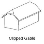 Clipped Gable Roof – A clipped gable roof is very similar to the standard gable roof but with the top of the end triangle “clipped”. In clipping the top of the triangle, it results in a truncated shape and leans back to the peak of the main roof on an incline. It creates a hybrid look somewhere between a gable roof and a hip roof.
